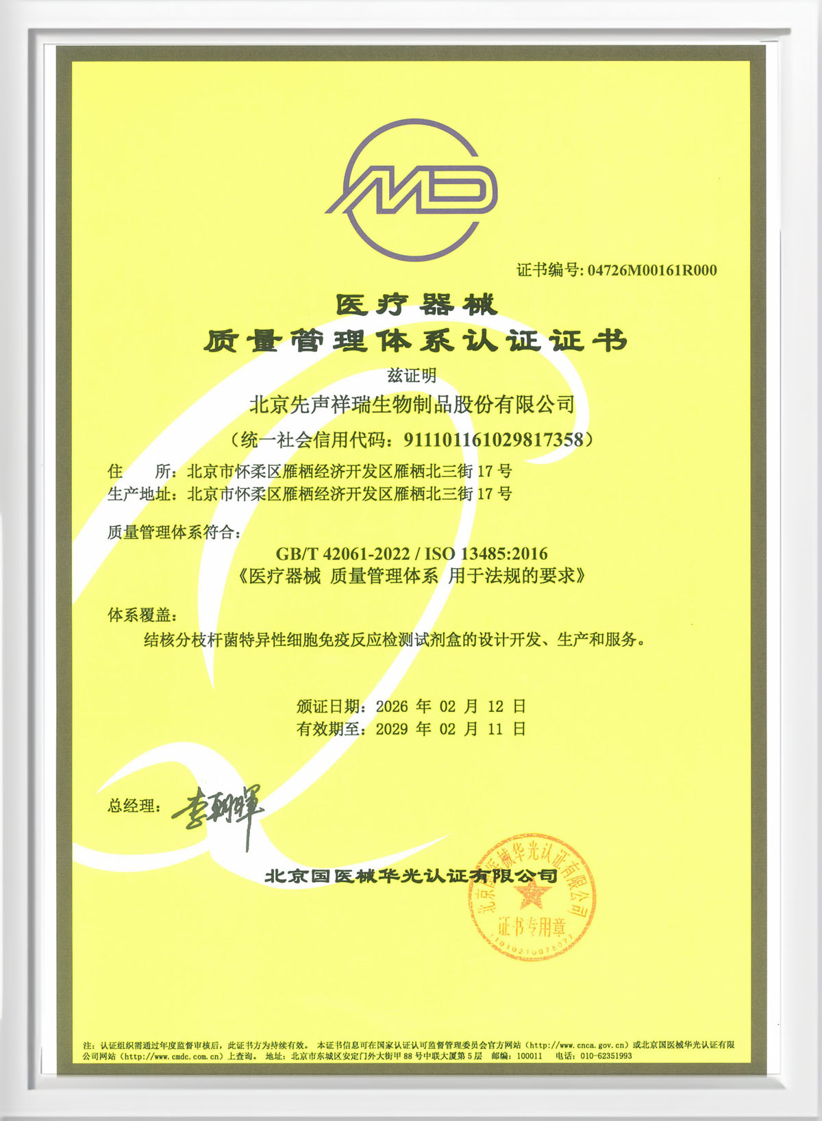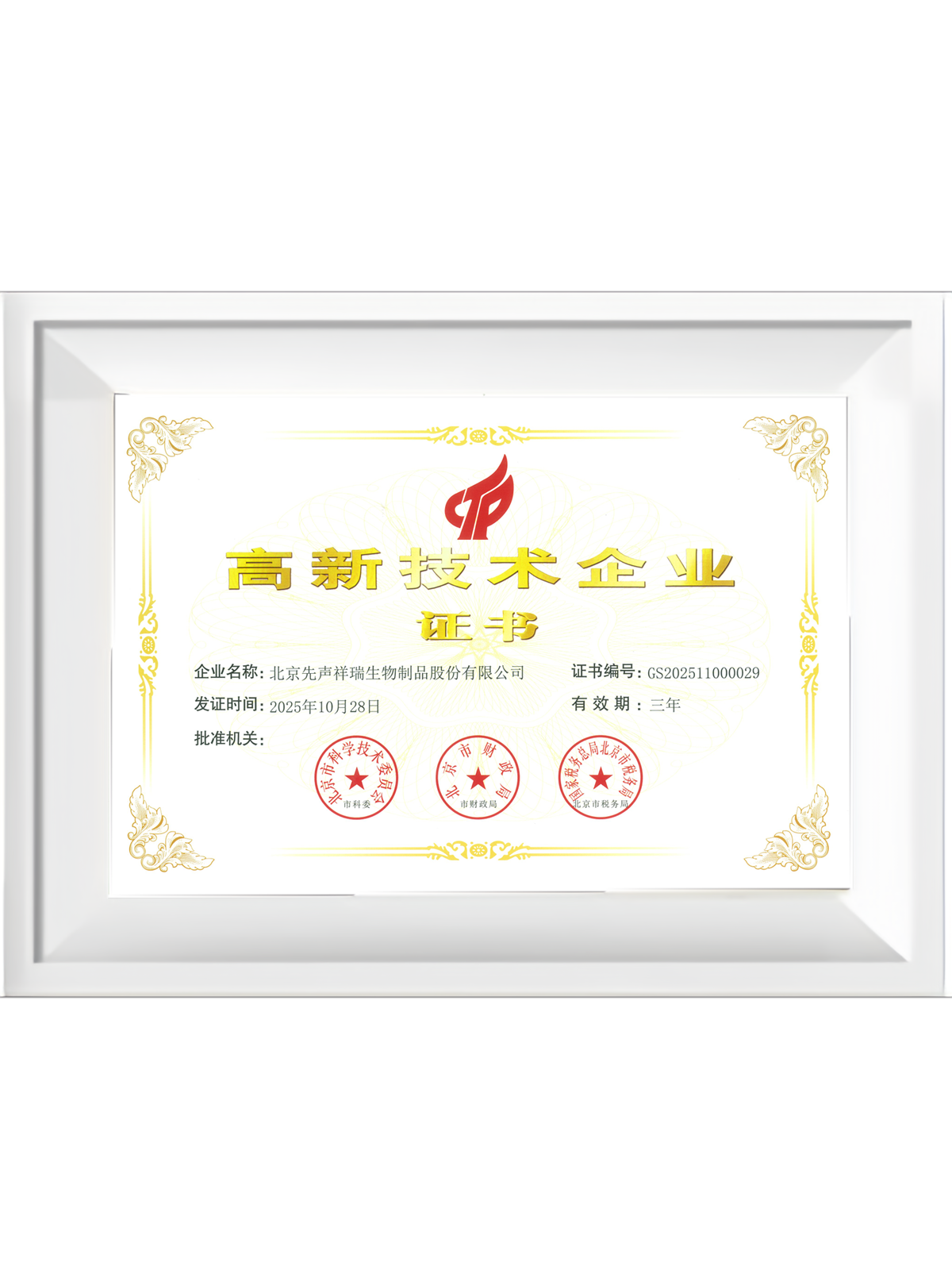 先声祥瑞 先声祥瑞发展历程企业文化 先声祥瑞是先声投资集团旗下成员企业,位于北京雁栖湖畔,怀柔科学城内,是一家正在成为创新驱动型的国家高新技术企业、北京市专精特新“小巨人”企业。集研发、生产、销售预防用生物制品、生物药、化学药、体内及体外诊断试剂为一体,聚焦抗感染、传染病、疫苗领域,全面打造“结核领域一体化解决方案的服务商”,以“致力创新疫苗,造福人类健康”为目标,并不断努力前行! 发展历程 2000 2003 2011 2012 2013 2014 2016 2019 2020 2021 2022 2023 2024.01 2024.02 北京祥瑞生物制品有限公司成立 公司迁址注册于怀柔区雁栖经济开发区(现怀柔科学城),建设疫苗生产基地 具有自主知识产权的国家一类新药A、C群脑膜炎球菌结合疫苗瑙幔宁®取得「新药证书」、「药品注册批件」 A、C群脑膜炎球菌结合疫苗瑙幔宁®上市销售 结核菌素纯蛋白衍生物 (TB-PPD) 再上市 卡介菌纯蛋白衍生物 (BCG-PPD) 再上市 先声投资集团收购祥瑞生物 荣获国家高新技术企业 荣获中国防痨协会科学技术一等奖中国防痨协会结核病医学转化创新基地 荣获第一批北京市专精特新 “小巨人”企业称号 3月 建立mRNA疫苗技术平台7月 登陆新三板并进入创新层,证券简称:祥瑞生物 证券代码:873821 11月1日,公司更名“北京先声祥瑞生物制品股份有限公司”,发布全新CI 荣获“北京市企业技术中心”称号;BMII车间取得药品生产许可证,公司发展再迈坚实一步 Xi01产品获批医疗器械注册证 企业文化 企业使命 让患者早日用上更有效药物 核心价值观 患者第一、群体奋斗、诚信、杰出 先声 CI Simcere源自英文sincere,体现先声真诚待人之道。 左侧是先声人迎风奔跑的旗帜,代表不懈奋斗和敢于 追求杰出的精神。 绿色寓意着生命、健康和活力。 下载.AI 下载.JPG 下载.PNG 先声管理原则 1. 先声生而为患者。 2. 聚焦“更有效、差异化”。 3. 以客户为中心。 4. 正直与公正。 5. 主人翁精神。 6. 极高的用人标准。 7. 学用他人所长。 8. 向外拓展不“内卷”。 9. 全力创造高绩效。 10. 注重投入产出。 11. 坚持自我批判。 企业荣誉 北京市节水型单位 中国防痨协会结核病医学转化创新基地 高新技术企业 北京市“专精特新”中小企业 北京市专精特新“小巨人”企业 北京结核病诊疗技术创新联盟常务理事单位 医疗器械质量管理体系认证 中国疫苗协会理事单位 荣获中国防痨协会科学技术奖一等奖 北京结核病诊疗技术创新联盟常务理事单位证书 北京市商业秘密保护示范基地 ISO9001 数智化 北京市企业技术中心 快乐慈善促进会爱心企业称号